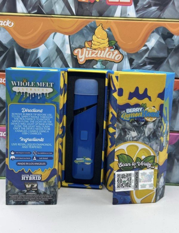 Experience the best of both worlds with the Berry Lemon Head Whole Melts Disposable – Hybrid, a top-tier vape pen that blends flavor and balance. Crafted using 85% pure THC distillate and enriched with natural terpenes, this 2G disposable offers smooth hits and a fruity citrus kick with every puff.